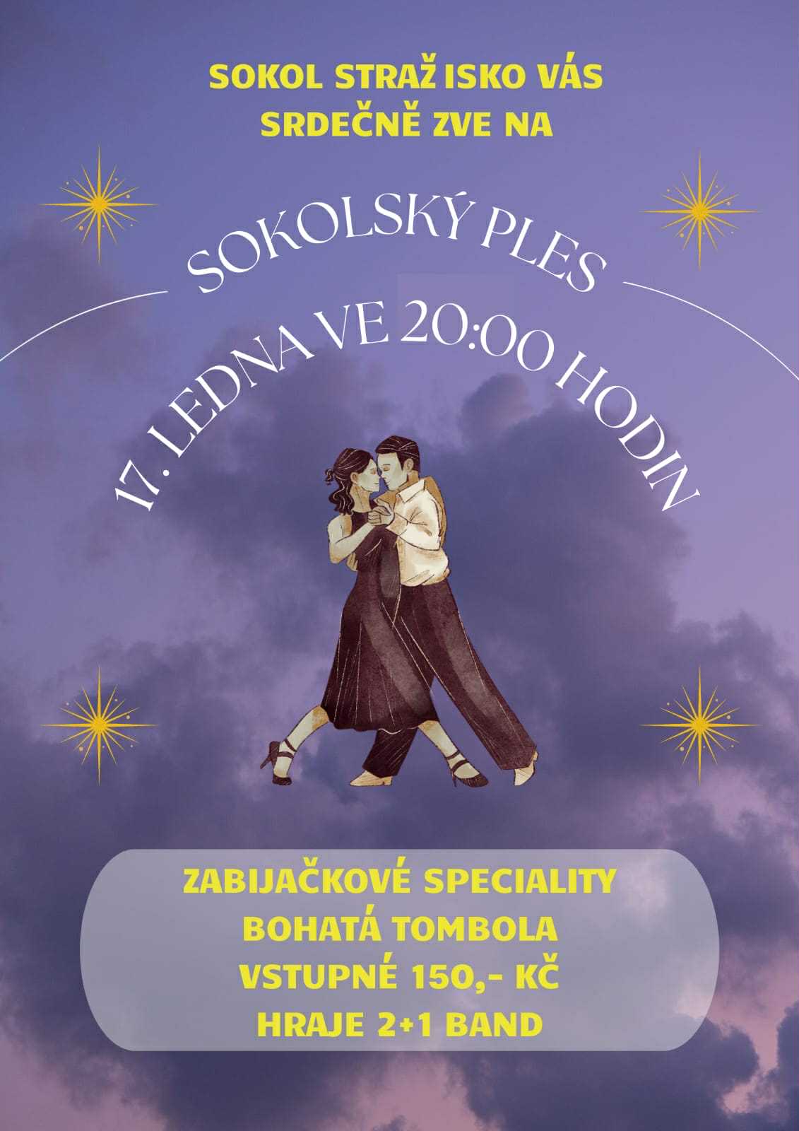 SOKOL STRAŽISKO VŠECHNY SRDEČNĚ ZVE V SOBOTU 17.1.2026 OD 20:00 HODIN NA SOKOLSKÝ PLES. VSTUPNÉ 150,- KČ, BOHATÁ TOMBOLA,ZABIJAČKOVÉ SPECIALITY, HRAJE KAPELA 2+1 BAND.